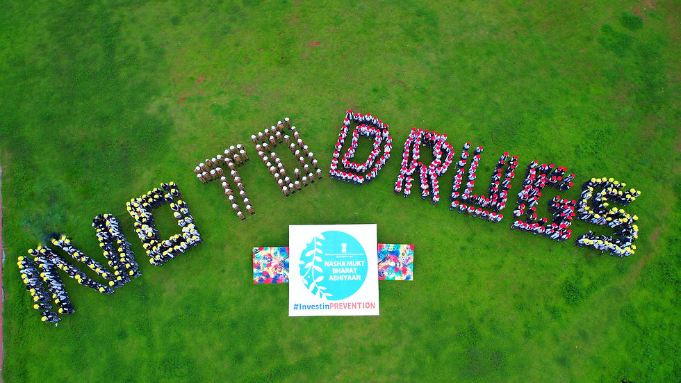 Student-led human formations spelling "No to Drugs" with 600+ participants.